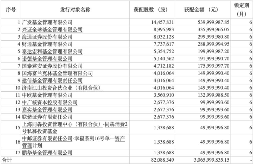 此外,该笔定增还吸引了许多其他类型的机构投资者,包括海通证券、国泰君安证券、联储证券、中邮证券在内的券商,以及江山投资、中广核资本、同犇投资在内的一二级各类背景的投资机构也有获配。
