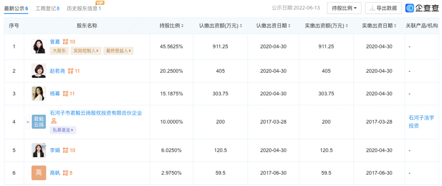 企查查信息显示,截至目前,杨幂持有嘉行传媒15.19%股权,为公司第三大股东。曾嘉、赵若尧、李娟分别持股45.56%、20.25%、6.02%。
