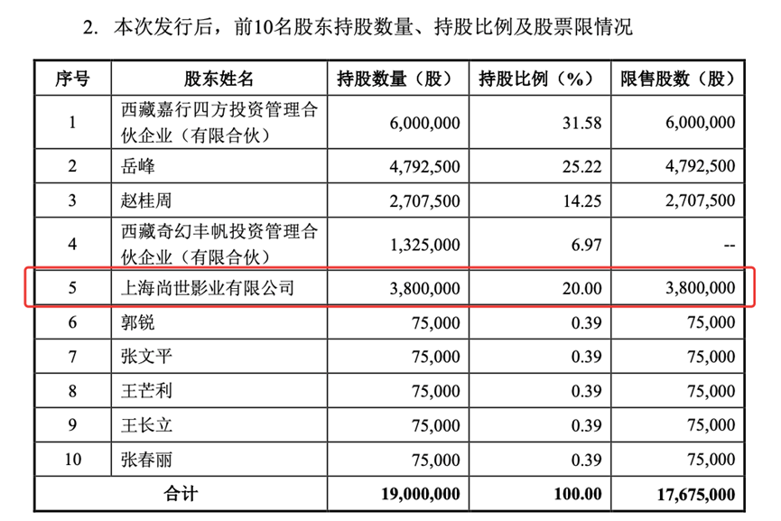 除了参与定增,君毅云扬还同时从嘉行传媒股东西藏奇幻丰帆投资管理合伙企业 (有限合伙)手中另外获得了嘉行传媒100万股,持股比例攀升至10%,并保持至今。目前君毅云扬为嘉行传媒第四大股东。