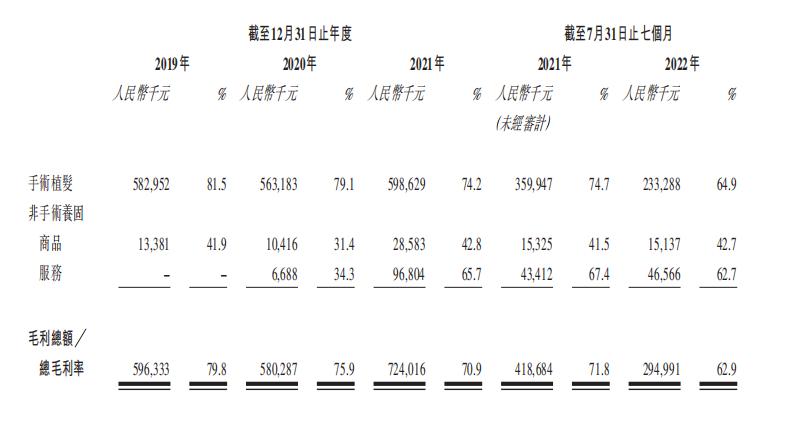 大麦从2020年6月起经营养护中心,固发及养发商品的毛利率在40%左右,约是植发手术毛利率的一半。