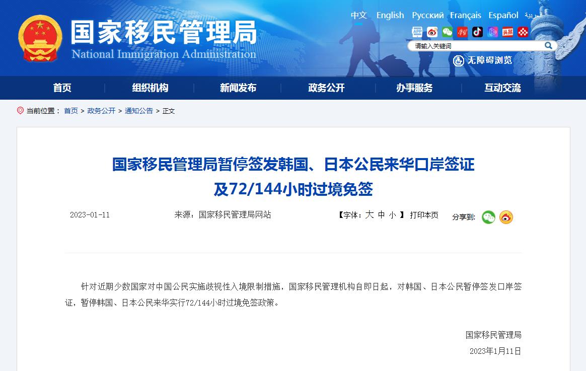针对近期少数国家对中国公民实施歧视性入境限制措施,国家移民管理机构自即日起,对韩国、日本公民暂停签发口岸签证,暂停韩国、日本公民来华实行72/144小时过境免签政策。