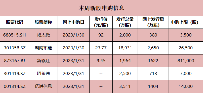 兔年首个交易周(1月30日—2月3日),将有5只新股进行申购,其中深市主板1只(亿道信息)、创业板2只(湖南裕能、阿莱德)、科创板1只(裕太微)、北交所1只(新赣江)。