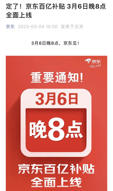 3月4日,京东在其公众号正式官宣:京东百亿补贴3月6日晚8点全面上线。