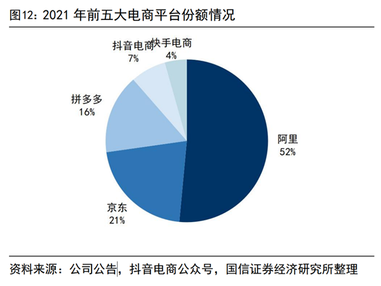 随着新进入者的强势入局,电商巨头间的竞争日趋白热化,淘宝、京东等老牌电商巨头更是“压力山大”。尤其是排名第二位的京东和第三位的拼多多,二者2021年的份额分别为21%和16%,仅相差5个百分点。