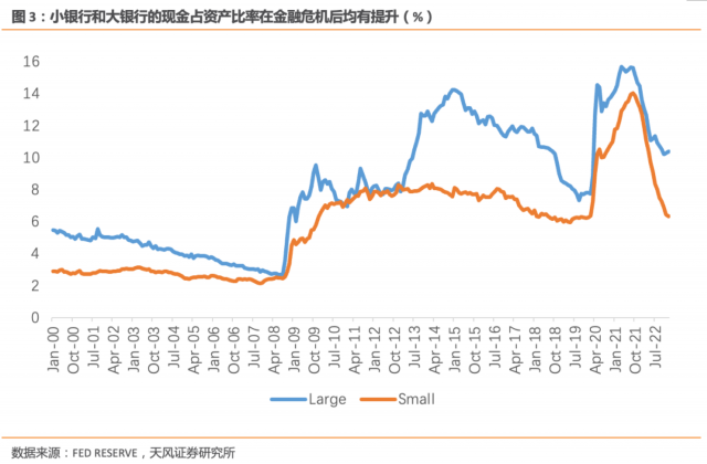 金融危机后美国大小银行的现金资产占比均大幅提升。其中小银行的现金资产占比从2007年10月的2.14%上升至2023年1月的6.31%。大银行的现金资产占比在2007年时与小银行相同,但由于金融危机后政府加强了对大银行的监管,目前现金资产占比升至10.4%。而硅谷银行的现金资产占比为7%,高于小银行的平均水平,因此硅谷银行并不是因为现金持续率太低而不能应对正常的提款冲击。