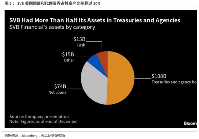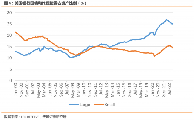 真正让硅谷银行资产端出问题的原因在于其配置久期过长。美国大银行的国债和代理债券资产占比普遍在25%,小银行的国债资产占比在14%,而硅谷银行的这一数字超过了50%,所以在加息环境下一旦面对挤兑而被迫出售资产,将面临巨额损失。