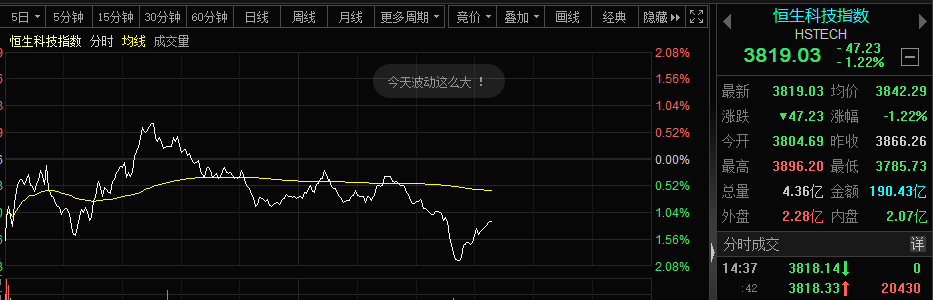 港股也走得不好。早盘,恒生科技一度大幅翻红,午后也快速杀跌。最多时,跌幅也达2%以上。