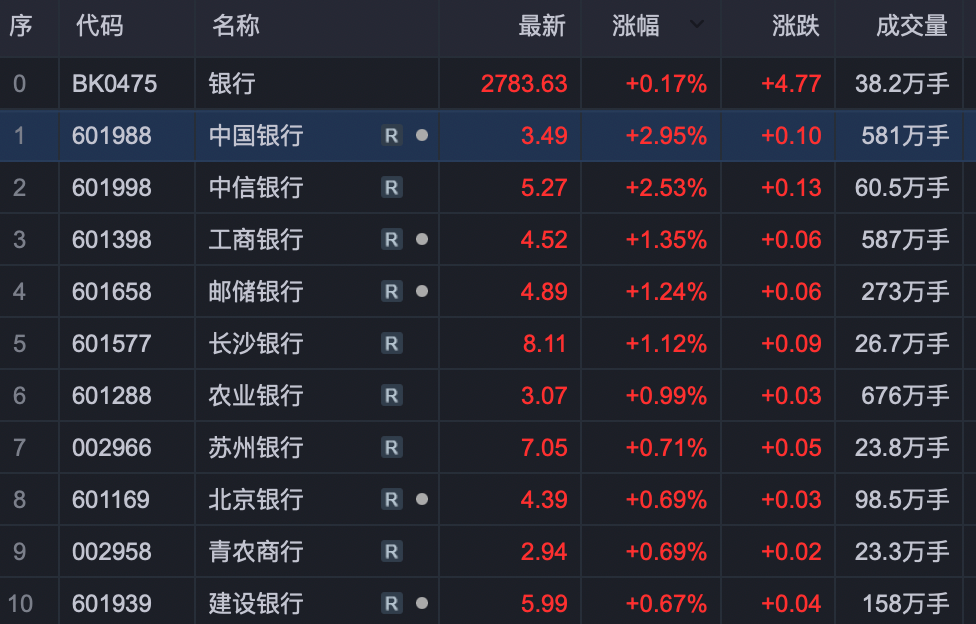 其中,中国银行、中信银行涨超2%,工商银行、邮储银行等涨逾1%。
