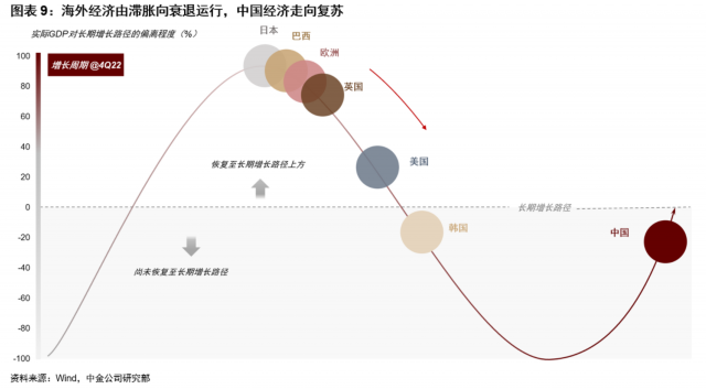 在去年11月发布的《2023年大类资产展望:势极生变》中,我们建议超配3种资产:黄金、美国债券与中国股票(同时建议低配商品,标配中债与美股)。至今十年期美债利率累计下行60bps,黄金累计上涨12%,中国股票相对2022年也有不错收益,其实正是反映一种宏观必然性:从资产轮动角度讲,海外经济由滞胀向衰退运行,会逐渐推动货币政策转松,占优资产先由现金转向债券与黄金,再转向股票。
