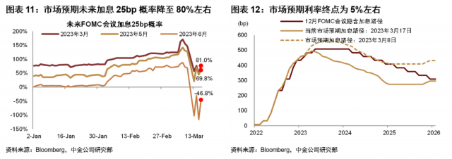 硅谷银行事件后,美联储与其他相关监管机构快速做出反应,不但对硅谷银行储户存款提供全额保护,而且推出新的融资工具银行定期融资计划(BTFP),向所有可能陷入流动性问题的存款机构给与贷款支持。瑞信风险暴露后也很快获得了瑞士央行的500亿瑞士克朗借款[1]。虽然未来金融风险演绎路径仍然难以预测,但近期欧美央行的果断举措策已经透露政策转向信号。目前联储加息预期已经大幅降温,市场预测3月份加息25bp概率已经降到80%左右,加息高点降至5%附近。
