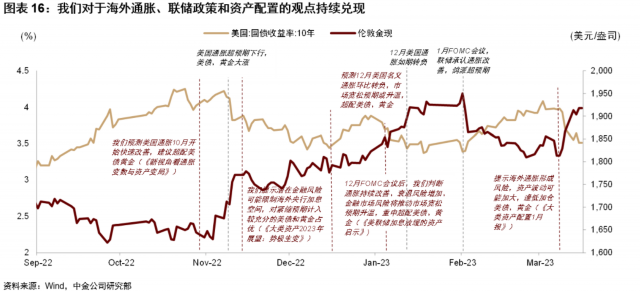 在2022年美元出现筑顶迹象后,机会已经开始向美债和黄金倾斜。这种占优资产轮动受三大因素推动:美国通胀快速改善、金融市场风险增大、经济逐渐走向衰退。虽然无法准确预测金融风险与经济衰退的具体时点,但考虑到2023年出险概率明显上升,即使3月份不发生硅谷银行挤兑,今年出现其他风险事件的概率也大幅提升,因此美债与黄金的配置性价比明显上升。与此同时,我们预测美国通胀在2023H1进入快速下行通道(《新视角看通胀变数与资产变局》),也有利黄金美债表现。根据上述分析,我们一直对“higher for longer”持怀疑态度,预期联储政策2023年终会转向宽松。在1月FOMC会议上,鲍威尔首次承认通胀发生重大转折,弱化“higher for longer”表述,强调“data dependent”,证实了我们的判断。由于市场具有前瞻性,我们认为等待加息停止之后才增配美债和黄金将错过交易机会,因此自年初起就坚定建议增配黄金与美债。事后看,市场演绎基本符合我们此前预判。