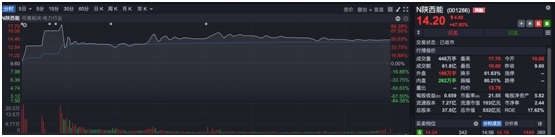 相对比较“冷静”的是陕西能源,可能因为盘子很大,开盘只有4%的涨幅,但随后很快就是连续两次盘中临时停牌,最大涨幅也一度超过80%。从陕西能源的走势其实也可以看出,盘中高价追涨的资金已经遭遇一个20CM跌停板:最高价17.70元,收盘14.20元,刚好跌了20%。