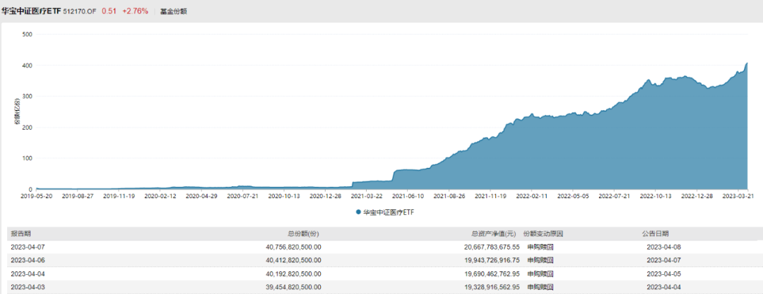 此外,4月以来,易方达沪深300医药卫生ETF等多只医药主题ETF获得了大笔资金净流入,基金份额纷纷创历史新高,其中华宝中证医疗ETF的基金份额突破400亿份。