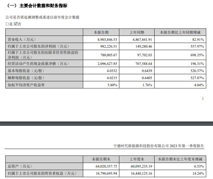 宁德时代(300750)4月20日晚间发布一季报,2023年第一季度实现营业收入890.38亿元,同比增长82.91%;净利润98.22亿元,同比增长557.97%;基本每股收益4.03元。