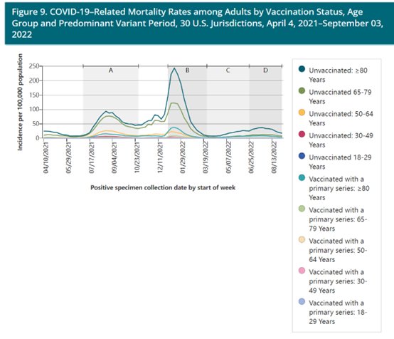 美国CDC发表的美国18岁及以上人群的新冠死亡率图表。