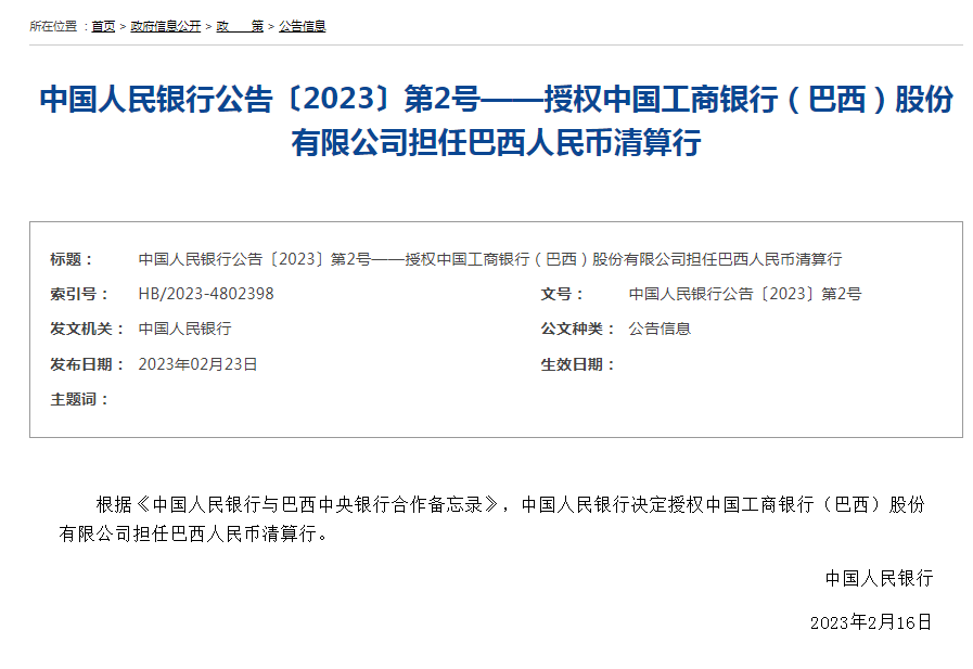 中国和巴西今年年初签署了在巴西建立人民币清算安排的合作备忘录。2月23日,中国人民银行发布公告,授权工银巴西担任巴西人民币清算行。