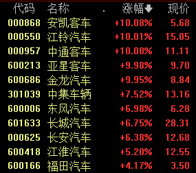 汽车整车板块大涨。安凯客车、江铃汽车、金龙汽车等多股涨停。