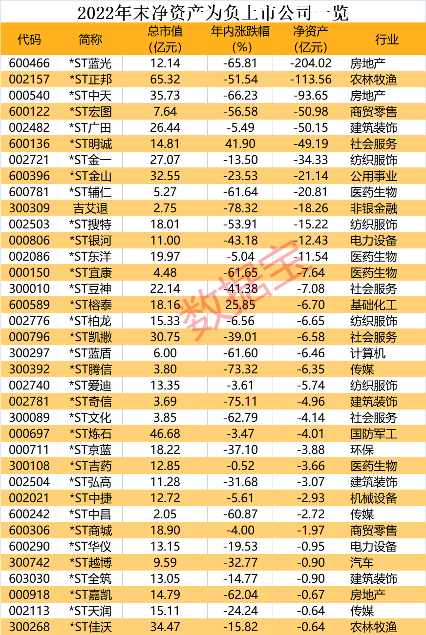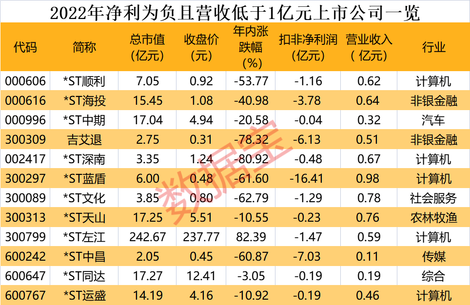 具体来看,*ST蓝光、*ST正邦、*ST中天、*ST宏图等36股2022年期末净资产为负值。*ST顺利、*ST海投、*ST中期、*ST深南等12股2022年盈利为负且营业收入低于1亿元。