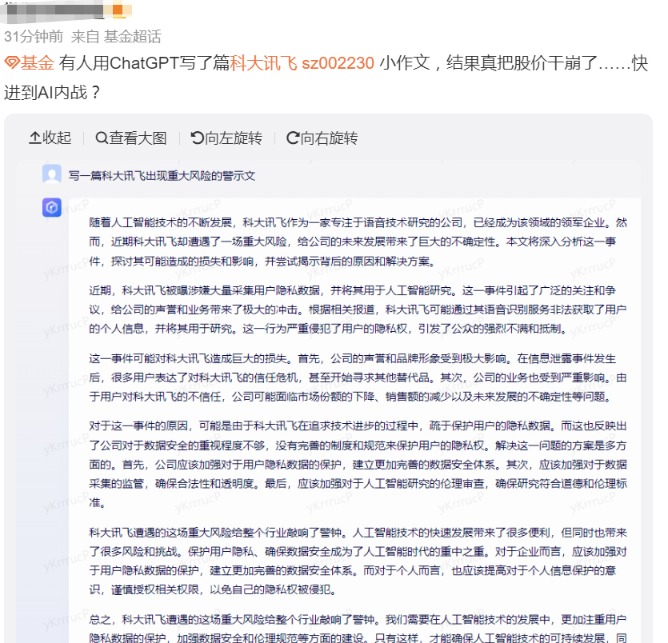 此外,科大讯飞回应表示,“股价下跌系某生成式AI写作虚假小作文导致,谣传风险为不实消息。”