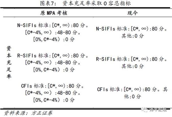 资本充足率被认为是MPA考核中最关键的指标。从国际经验来看,巴塞尔协议I、II、III均对资本充足率进行重点要求,各国金融监管当局使用这一指标来监测银行抵御风险的能力,目的在于抑制风险资产的过度膨胀,保护存款人和其他债权人的利益、保证银行等金融机构正常运营和发展。年后MPA考核中,资本充足率取消容忍度指标,对于未达标的银行将得0分。MPA考核此前自2016年推出以来,不可能一步到位,给予被考核机构一定的能动空间,特别是规模较小、风险较高的地方及区域性商业银行,在MPA考核推出一段时间后,根据现实经济情况调整评价考核体系,明确考核的重点和限制,进一步加强对被监管机构的有效监管,谨防银行等为通过MPA考核进行短期调整,旨在长期引导、规范银行的市场行为。