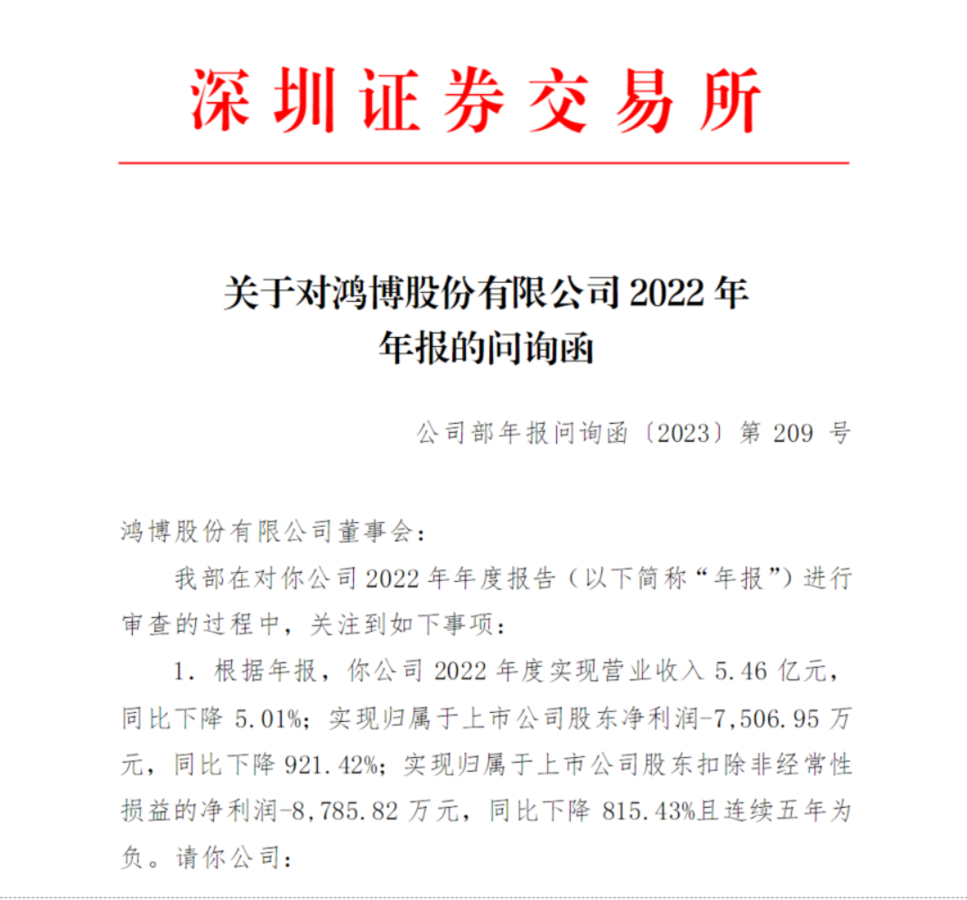 消息面上,6月2日凌晨,鸿博股份发布《关于延期回复深圳证券交易所 2022 年年报问询函的公告》,向深圳证券交易所申请延期回复《关于对鸿博股份有限公司2022年年报的问询函》(以下简称“《问询函》”)。