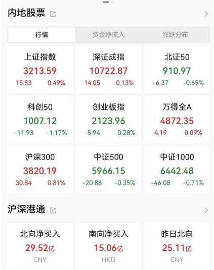 截止收盘沪指涨0.5%,深成指涨0.13%,创业板指跌0.28%。两市共1779只个股上涨,3229只个股下跌,北向资金净买入29亿元。