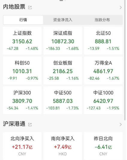 三大指数盘中探底后震荡回升,午后又再度下挫走弱。截止收盘沪指跌1.48%,深成指跌1.68%,创业板指跌1.16%。北向资金净买入21亿元。