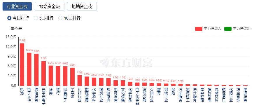 行业资金方面,截至收盘,电池、电子元件、通信设备等净流入排名靠前,其中电池净流入13.08亿元。