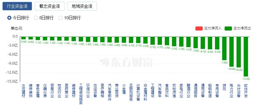 净流出方面,软件开发、光伏设备、电力行业等净流出排名靠前,其中软件开发净流出13.28亿元。