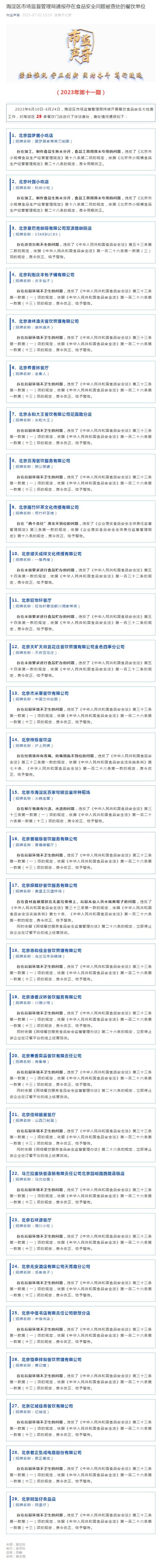 北京市海淀区市场监督管理局在其公众号通报存在食品安全问题被查处的餐饮单位。6月10日-6月24日,海淀区市场监督管理局持续开展餐饮食品安全大检查工作,对海淀区29家餐饮门店进行了依法查处。