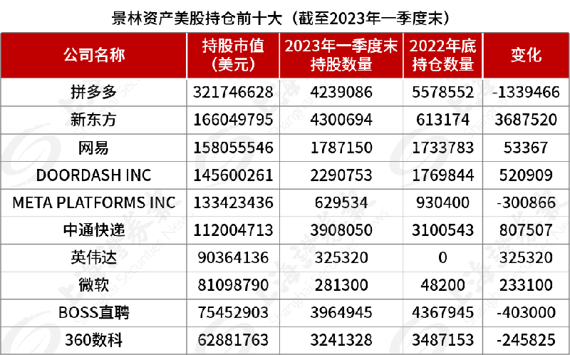 美国证券交易委员会披露信息显示,截至今年一季度末,人工智能芯片公司英伟达新进成为景林资产美股持仓的前十大重仓股,持股数量为32.5万股,持股市值达9036万美元,而在2022年底景林资产对英伟达的持股数量为0。今年上半年,英伟达股价涨幅接近190%。