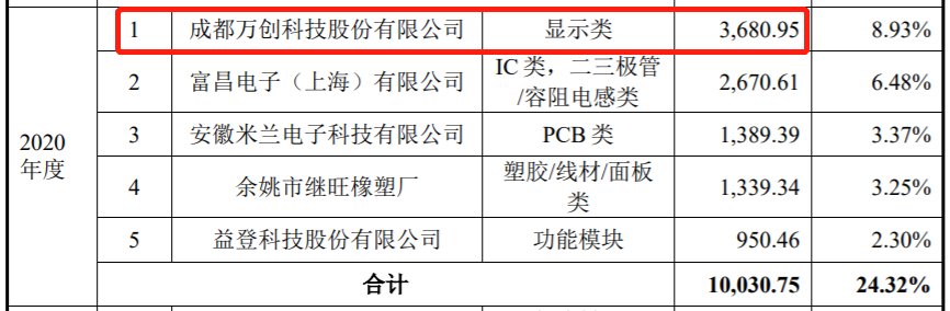 但据艺唯科技此前发布的招股书披露,2020年向万创科技销售显示类产品金额高达3680.95万元,而且截止到2020年末该公司对万创科技的应收账款余额高达2806.57万元。艺唯科技所称的显示类产品,对应着万创科技披露的LCD屏幕,但是万创科技在招股书中披露2020年采购的LCD屏幕金额总共只有2801.05万元,这相比艺唯科技披露的销售金额少了800万元以上,甚至还不及艺唯科技披露的2020年末对万创科技的应收账款余额高。