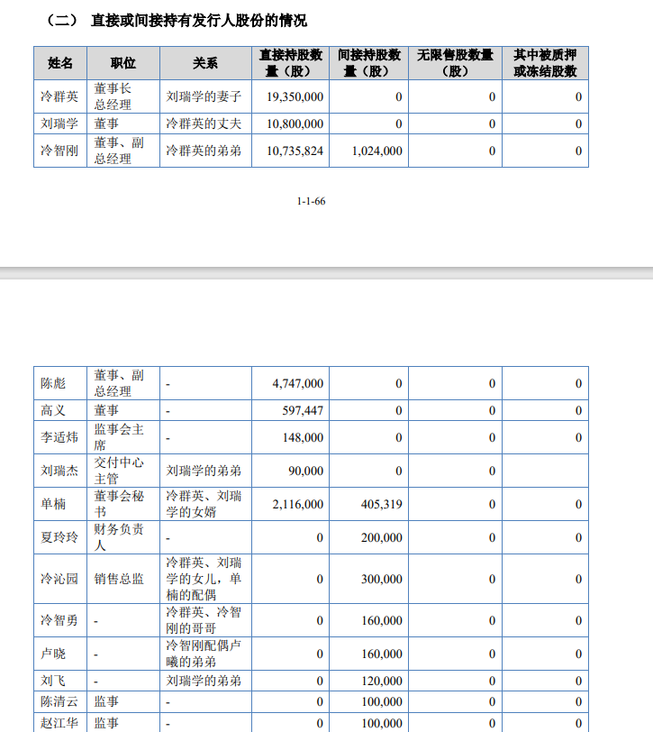 从股权架构上来看,芭薇股份呈现出明显的“家族”特征。实控人为刘瑞学、冷群英夫妻二人,冷群英的弟弟冷智刚持股14.02%,担任董事、副总经理;实控人女婿单楠持股2.76%,担任董事会秘书,并为员工持股平台芭薇有限合伙的执行事务合伙人。此外,冷群英的女儿、哥哥、弟弟配偶的弟弟,刘瑞学的弟弟均直接持股或通过员工持股平台间接持股。