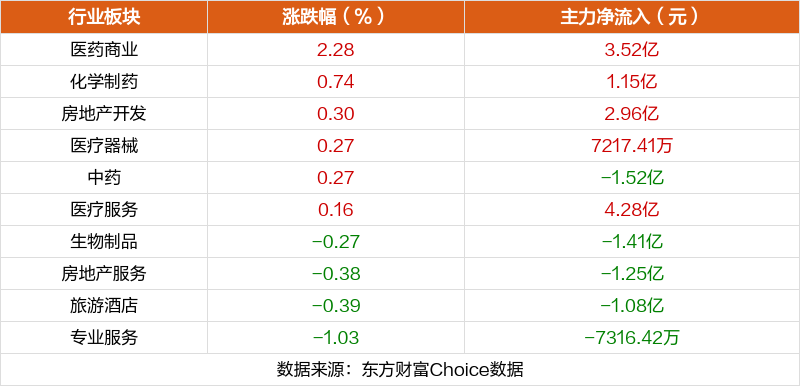 板块方面,医药商业、化学制药、房地产开发等板块涨幅居前,证券、燃气、保险等板块跌幅居前。