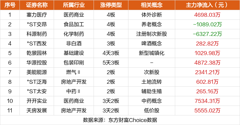 其中,体外诊断塞力医疗4板,养老概念*ST交昂4板,注册制次新股科源制药4板。