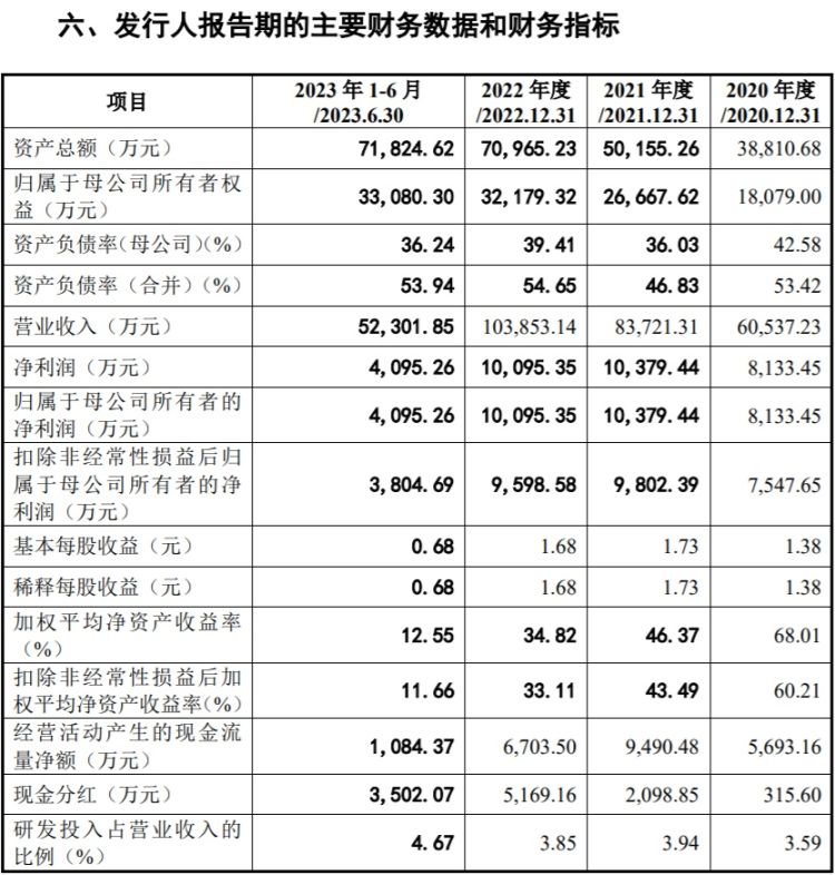 业绩方面,2020年-2022年、2023年上半年(以下简称“报告期”),公司实现营业收入分别为6.05亿元、8.37亿元、10.39亿元和5.23亿元;实现净利润分别为8133.45万元、1.04亿元、1.01亿元和4095.26万元。其中,营收连年增长,净利润在2022年稍有下滑。