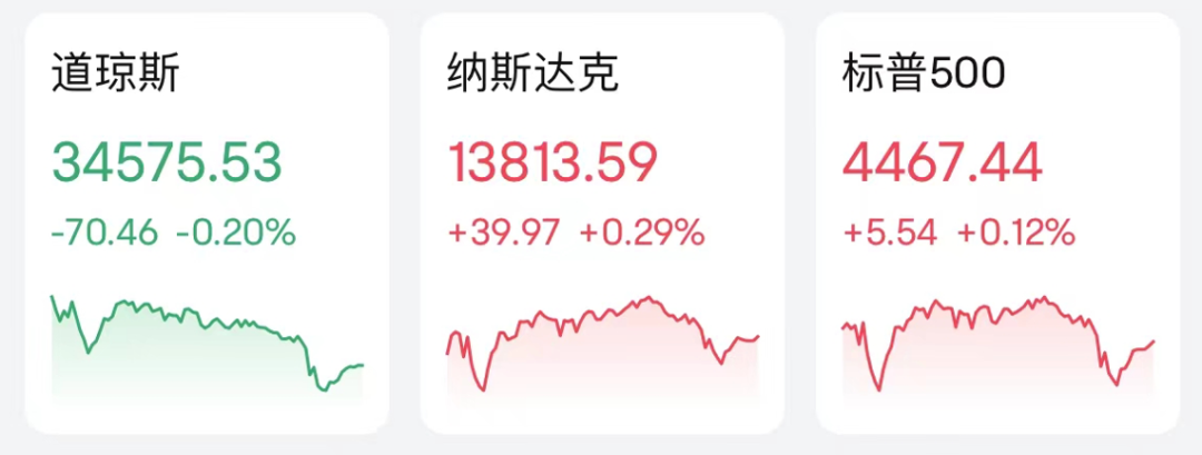 周三,美股三大指数涨跌不一。标普500指数收涨5.54点,涨幅0.12%,报4467.44点。道指收跌70.46点,跌幅0.20%,报34575.53点。纳指收涨39.97点,涨幅0.29%,报13813.58点。