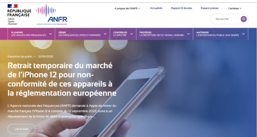 当地时间周二,法国国家频谱管理署(ANFR)表示,经过多次检测之后,发现iPhone 12辐射水平超标。因此,ANFR决定禁止苹果公司销售iPhone 12产品,自9月12日当天生效。