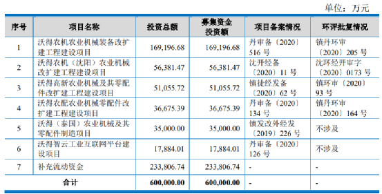 公司原计划公开发行不超过3亿股,拟募集资金60亿元,投入沃得农机农业机械装备改扩建工程建设项目、沃得农机(沈阳)农业机械改扩建工程建设项目、沃得高新农业机械及其零配件改扩建工程建设项目、沃得农配农业机械零配件改扩建工程建设项目、沃得(泰国)农业机械及其零配件制造项目、沃得智云工业互联网平台建设项目及补充流动资金,其中补流高达23.38亿元。