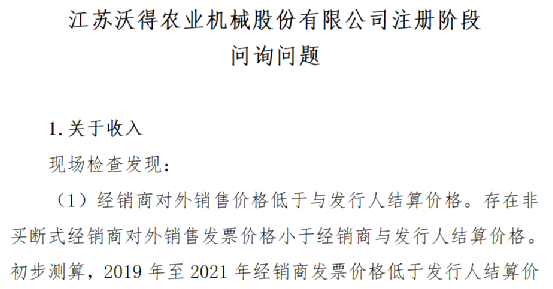 结合现场检查发现的问题,2023年1月13日中国证监会网站披露了《江苏沃得农业机械股份有限公司注册阶段问询问题》。在问询问题中,证监会重点关注了沃得农机收入的真实性、信息披露的完备性和内控的有效性等。