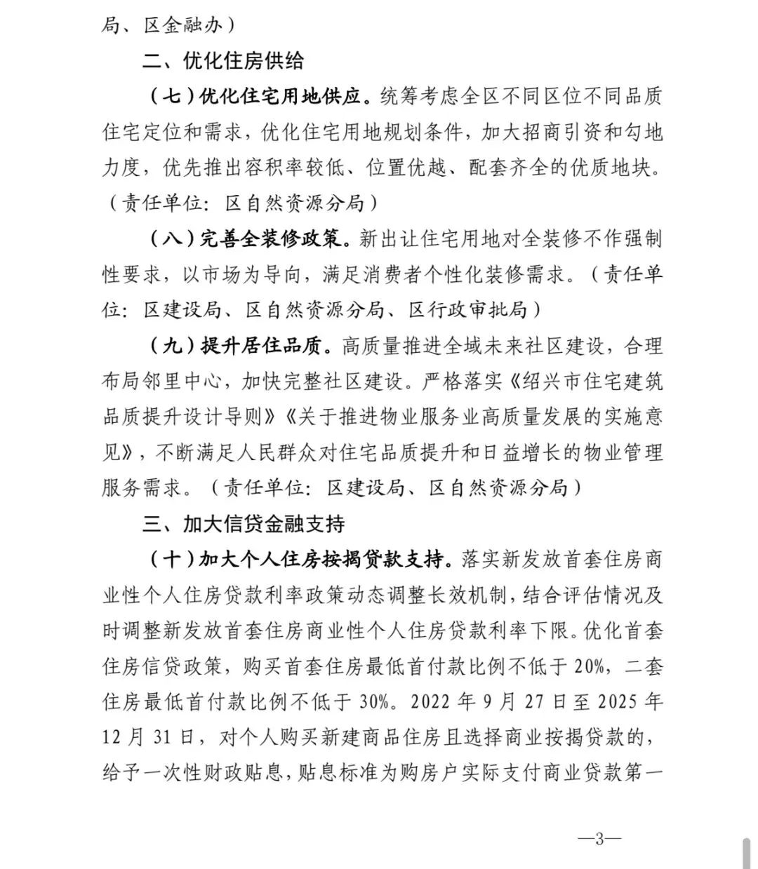 在加大信贷金融支持方面,《通知》提出,加大个人住房按揭贷款支持。落实新发放首套住房商业性个人住房贷款利率政策动态调整长效机制,结合评估情况及时调整新发放首套住房商业性个人住房贷款利率下限。优化首套住房信贷政策,购买首套住房最低首付款比例不低于20%,二套住房最低首付款比例不低于30%。2022年9月27日至2025年12月31日,对个人购买新建商品住房且选择商业按揭贷款的,给予一次性财政贴息,贴息标准为购房户实际支付商业贷款第一年利息额的15%,补贴方式参照契税补贴方式实施。