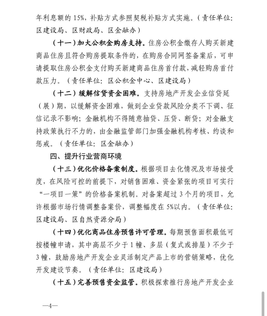 在提升行业营商环境方面,《通知》显示,根据项目去化情况及市场接受度,在风险可控的前提下,对销售困难、资金紧张的项目可实行“一项目一策”的价格备案机制。对备案超过3个月的项目,允许根据市场行情调整备案价,调整幅度在5%以内。