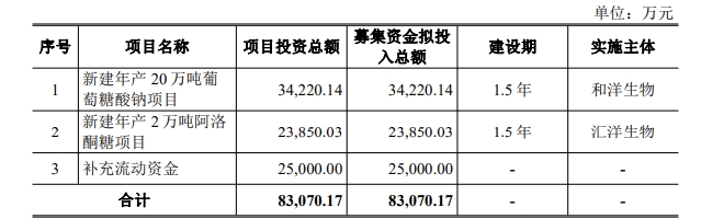 福洋生物此次拟募资8.31亿元,其中3.42亿元用于年产20万吨葡萄糖酸钠项目、2.39亿元用于年产2万吨阿洛酮糖项目、2.50亿元用于补充流动资金。