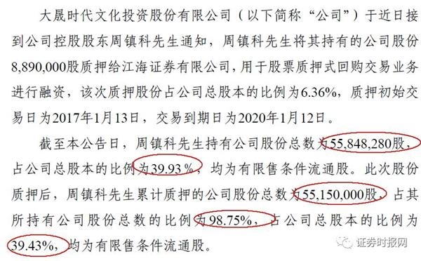 也即是说,截至2017年4月10日,该公司控股股东周镇科累计质押公司股份总数为5515万股,占其所持有公司股份总数比例为98.75%,占公司总股本比例为39.43%。大晟资产累计质押公司股份12615878股,占总股本的9.02%,二者合计占公司总股本的48.45%。
