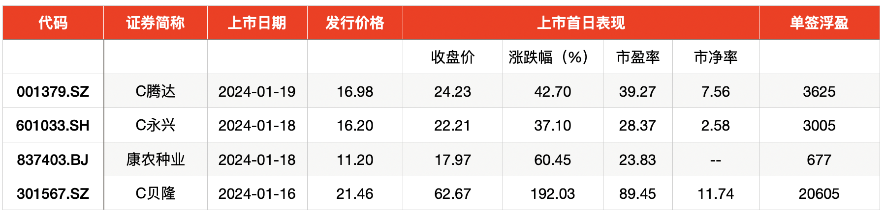 以收盘价计算,上周上市的4只新股中,仅有贝隆精密在上市首日股价翻倍。贝隆精密发行价为21.46元,上市首日收盘价为62.67元,涨幅达192.03%。以收盘价计算,投资者中一签,单签浮盈达20605元,是2024年第一只收益破2万元的肉签。