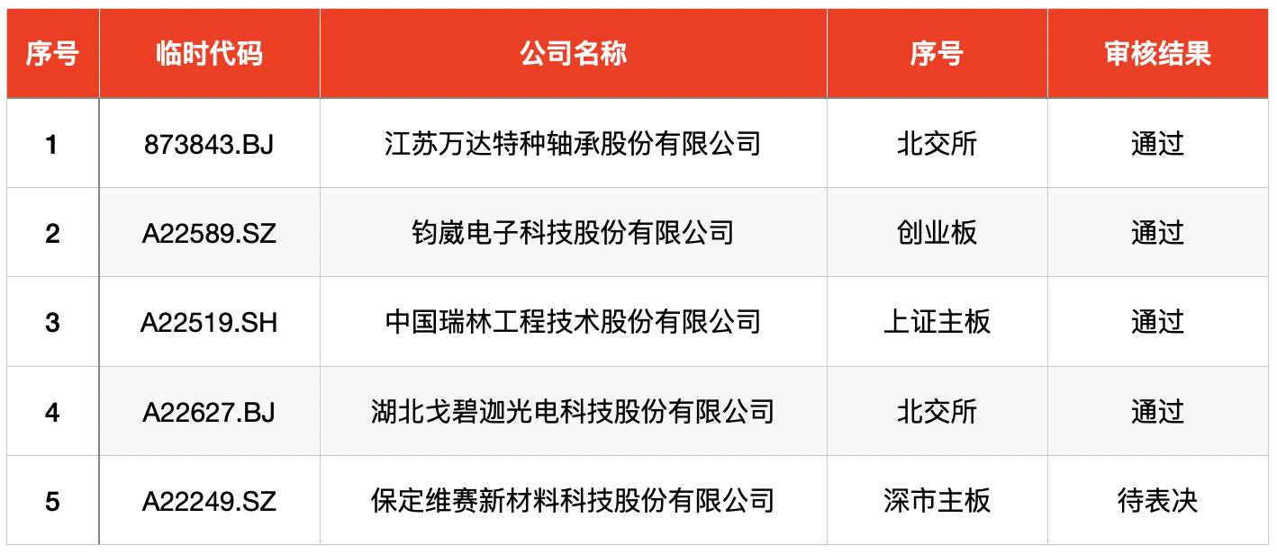 发审委审核方面,上周共有5家企业首发过会,其中,江苏万达特种轴承股份有限公司、钧崴电子科技股份有限公司、中国瑞林工程技术股份有限公司、湖北戈碧迦光电科技股份有限公司获得通过,保定维赛新材料科技股份有限公司(简称“维赛新材”)则是上会前夕被取消审核。