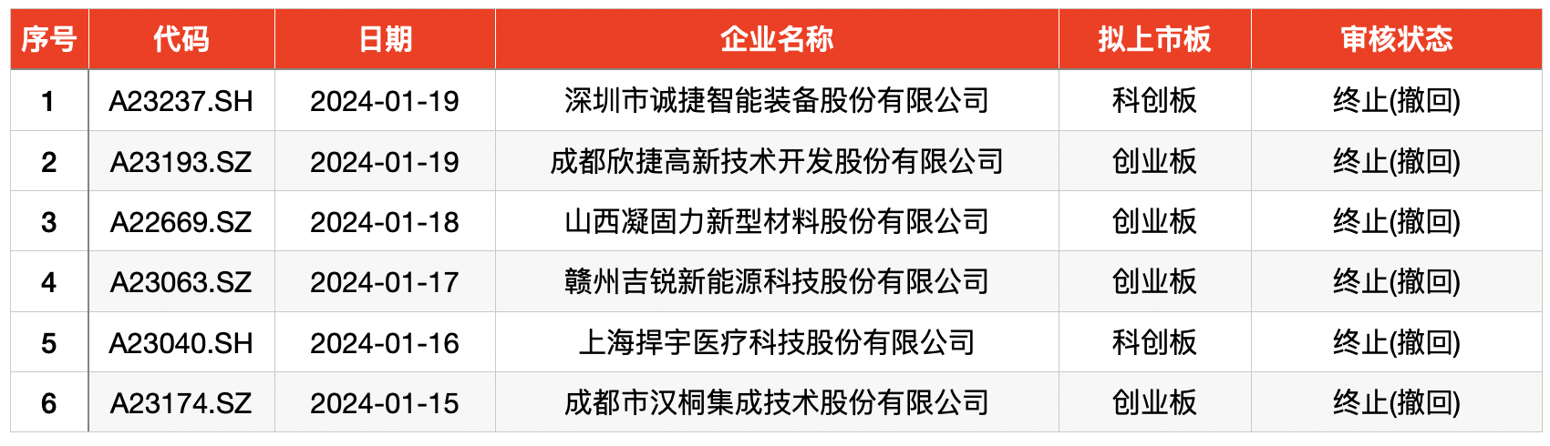 上周,共有6家企业终止IPO,均为主动撤回IPO材料。