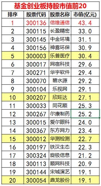 基金2016年年底重仓创业板市值前三名的股票分别为信维通信、长盈精密和中金环境,持股市值分别为43.4亿元、33亿元和31.1亿元,均大幅低于2015年年底基金创业板第一重仓股顺网科技所对应的65.3亿元。