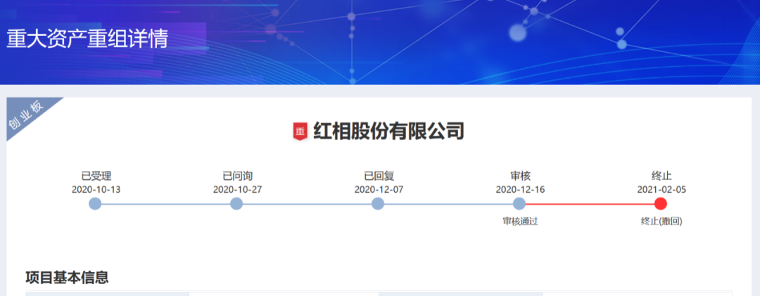2021年2月5日,红相股份发布公告,终止发行股份及支付现金购买资产并募集配套资金暨关联交易事项并撤回申请。