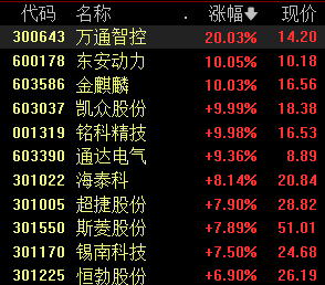 6月25日,汽车零部件板块盘中冲高,截至发稿,万通智控20%涨停,金麒麟4连板,东安动力、凯众股份、铭科精技涨停,恒勃股份、东利机械、超捷股份等集体高开。